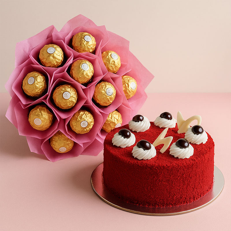 Indulge your special someone with the Lovers Delight gift set, featuring a luxurious bouquet of 16 Ferrero Rocher chocolates elegantly wrapped in two layers of pink paper. Complementing this sweet bouquet is a rich, moist red velvet cake, perfect for celebrating love and special moments with exquisite taste and style.