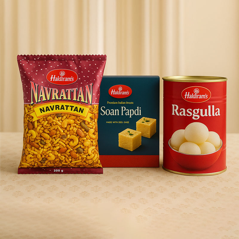 200g Haldiram's Navrattan 250g Soan Papadi 250g Dry Fruits With Zari Box