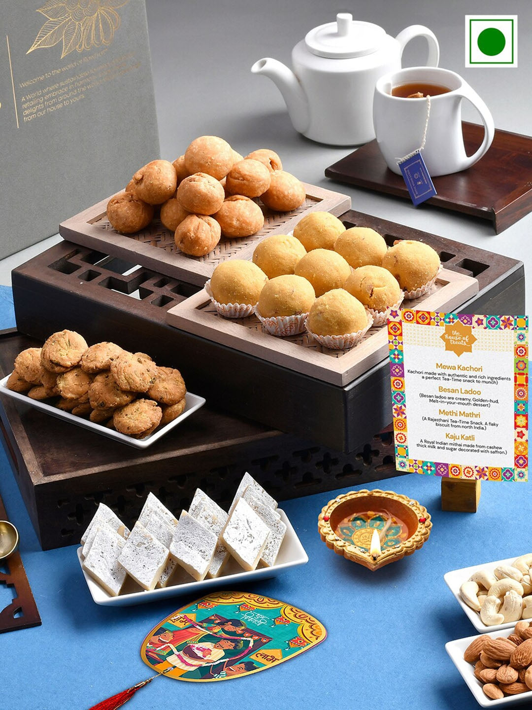 This diwali gift pack contains kaju katli, besan laddoo, kachori & methi swali