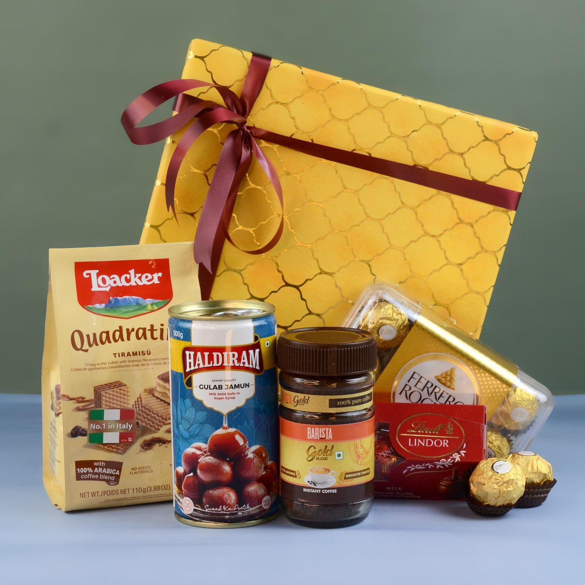 Indulge in a variety of delectable treats with our Assorted Treats Box. Enjoy the crispy goodness of Loacker Quadratini Wafer Cubes, the sweetness of Haldiram Gulab Jamun, the rich aroma of Barista Gold Blend Instant Coffee, and the smoothness of Lindt Lindor Milk Chocolate. And don't forget the indulgence of Ferrero Rocher, all presented in a designer yellow box.