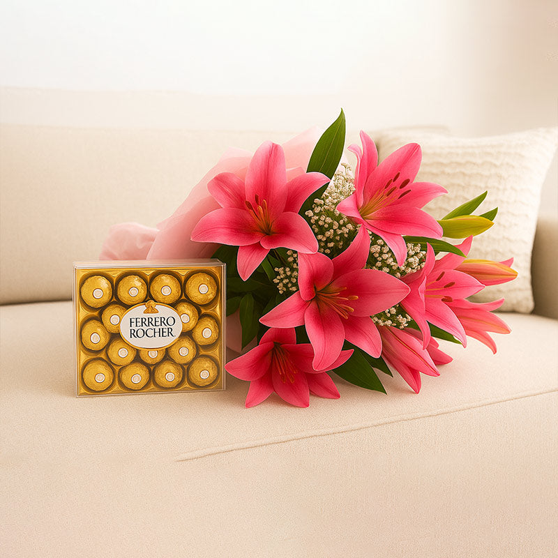 Bouquet of 6 pink asiatic lilies Two Layered Paper packing & Pink 24 Pcs Ferrero Rocher Chocolates.