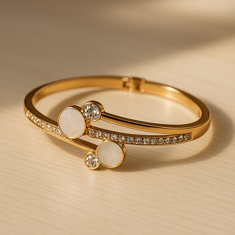 Crafted from premium gold-plated alloy, this Lustrous Harmony bracelet features elegant mother of pearl and sparkling cubic zirconia accents for refined sophistication. Its polished, smooth finish and adjustable hinge clasp offer comfortable wear and versatility. Ideal for gifting or enhancing festive and daily ensembles, this bracelet requires gentle care—simply wipe with a soft cloth and avoid exposure to water, perfumes, or harsh chemicals—to preserve its timeless elegance.