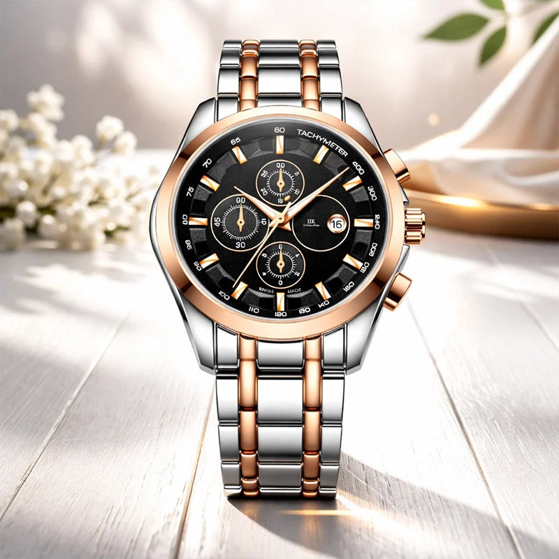 The LuxeChrono Orion Chronograph combines sophisticated engineering with refined aesthetics. This 42mm timepiece features a precision quartz chronograph movement housed in stainless steel with rose gold plating, delivering reliable timekeeping and functional chronograph capabilities. The black dial provides striking contrast against the two-tone stainless steel bracelet, while the 11mm profile ensures comfortable wrist presence. A fold-over clasp with safety mechanism secures the 22mm band, and 50M water resistance accommodates daily wear and incidental water exposure. Designed for the discerning gentleman who values both performance and style.