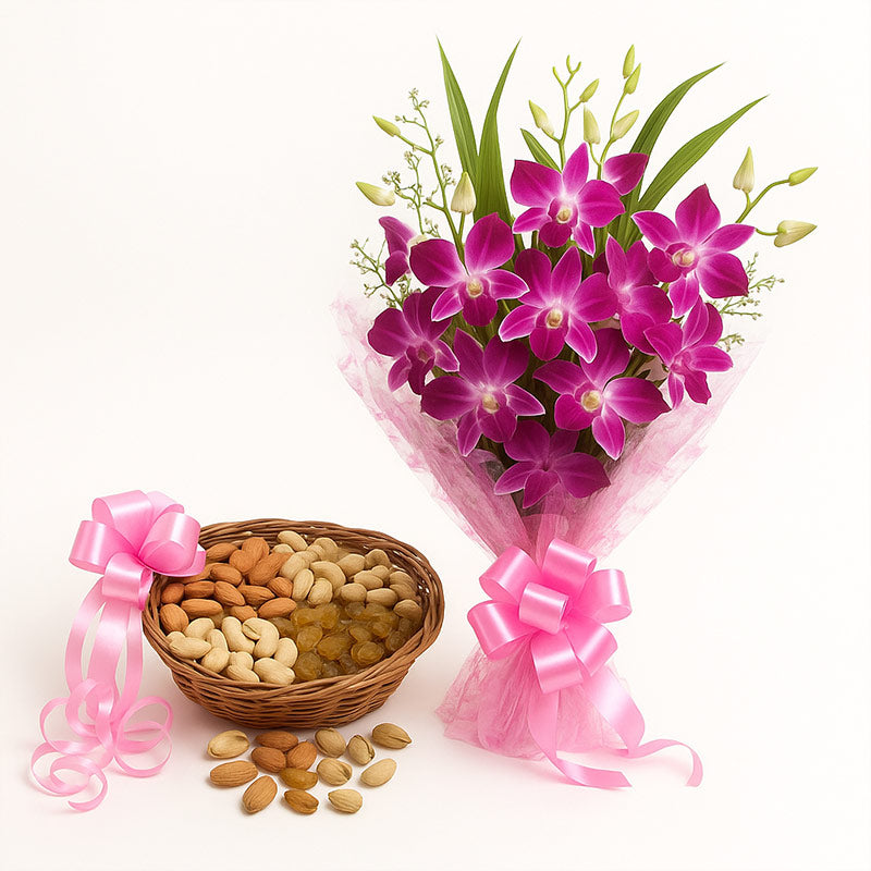 Perfect Elegance - Bring a warm smile on your loved ones' face with this amazing and wonderful bouquet of fresh and purple orchids. The 6 purple orchids are neatly tied in pink cellophane, along with a pink ribbon that enhances the beauty of the Beautiful Bunch. With this, a 500 gm Mix dryfruit basket.for your loved ones from Yuvaflowers .