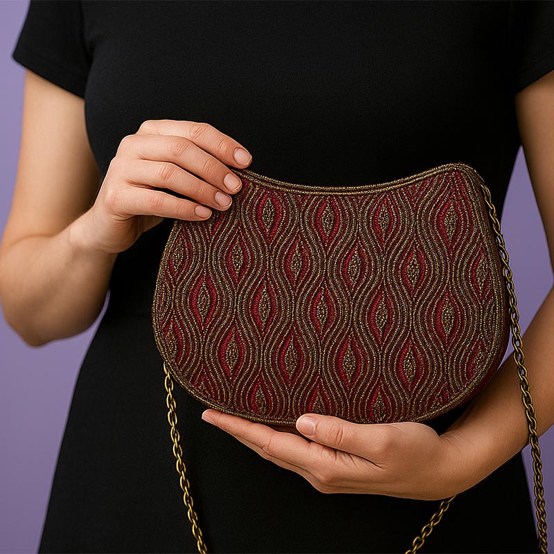 Crafted from premium fabric, this Regal Ruby Hand-Beaded Designer Clutch features intricate hand-embroidered bead and sequin work in ruby red complemented by golden bead accents. The detachable antique gold chain offers versatile styling options, while the magnetic snap ensures secure closure. Inside, a soft satin lining with a small utility pocket keeps essentials organized. Measuring approximately 8 x 6 inches, it is an elegant choice for parties, weddings, and evening events. Maintain its beauty by gently wiping with a soft dry cloth and storing it in a dust bag.