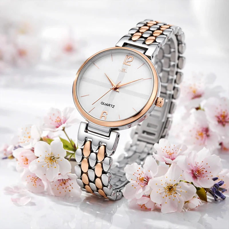 This sophisticated two-tone bracelet watch combines timeless elegance with everyday versatility. Featuring a precise quartz movement and classic analog display, the silver dial is framed by a rose gold bezel for a refined aesthetic. The stainless steel case pairs seamlessly with a matching two-tone bracelet in silver and rose gold, secured by a reliable fold-over clasp. Splash-resistant construction protects against daily moisture exposure, making it ideal for office settings, casual outings, and special occasions. A perfect accessory for the modern woman seeking style without compromise.
