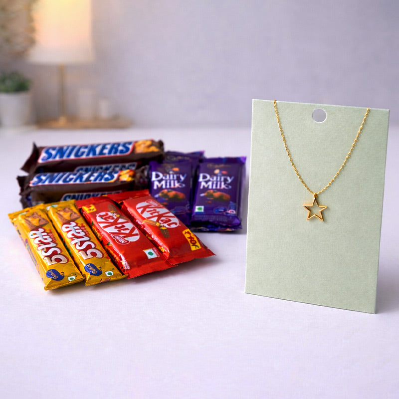 Celebrate your special moments with this thoughtfully curated gift combo that blends elegance with indulgence. The stunning gold-toned star pendant necklace serves as a timeless keepsake, while an assortment of premium chocolates-Snickers, Cadbury Dairy Milk, 5Star, and Kitkat-adds a delightful sweetness to your gesture. Perfect for birthdays, anniversaries, Valentine's Day, or simply expressing affection, this combination appeals to those who appreciate both style and taste. Each item is presented in secure, gift-ready packaging designed for immediate gifting without additional wrapping. An ideal choice for expressing love to your girlfriend, wife, fiancée, or cherished one.
