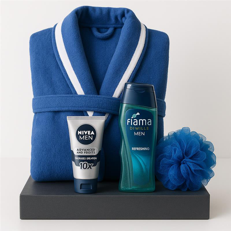 1 Soft Standard Size Bathrobe, with Fiama Di Wills Shower Gel for Men 200 ml along Blue Loofah, and 100 grams Nivea Advanced Whitening Face Wash for Men.